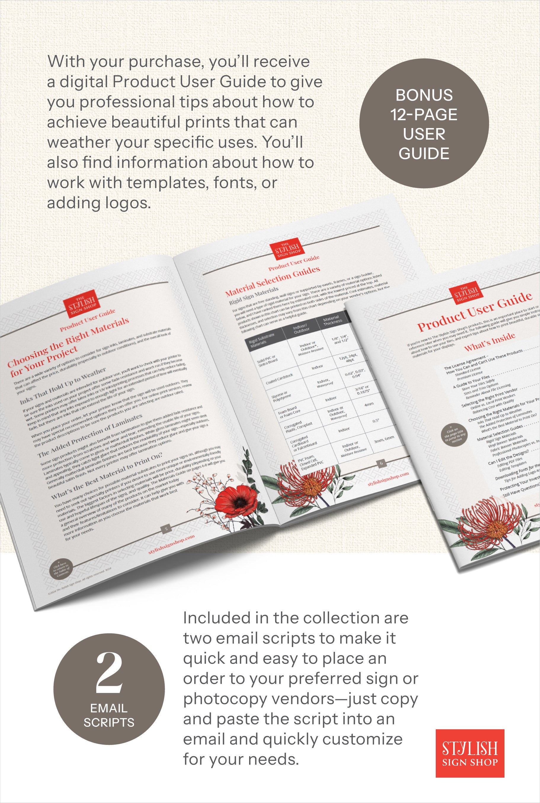 You are purchasing a limited license to use the artwork, not actual ownership of the artwork. This limited license should more than cover your needs, but the license stipulates that the products cannot be shared with anyone, nor re-sold in any part, and no elements extracted, re-purposed, and/or used in a new design. The artwork can be sent to a print vendor or a design contractor, but only for the purpose of providing minor customization (like adding your logo and updating templates) or for printing your order. The fonts, illustrations, and/or photos that may comprise these products belong to the artists who created them, and the Stylish Sign Shop (licensee: Liz King) is allowed limited use under strict license compliance and fees to use those elements in our designs. The designs created from those assets are also unique to Stylish Sign Shop’s design and they belong solely and exclusively to Stylish Sign Shop.